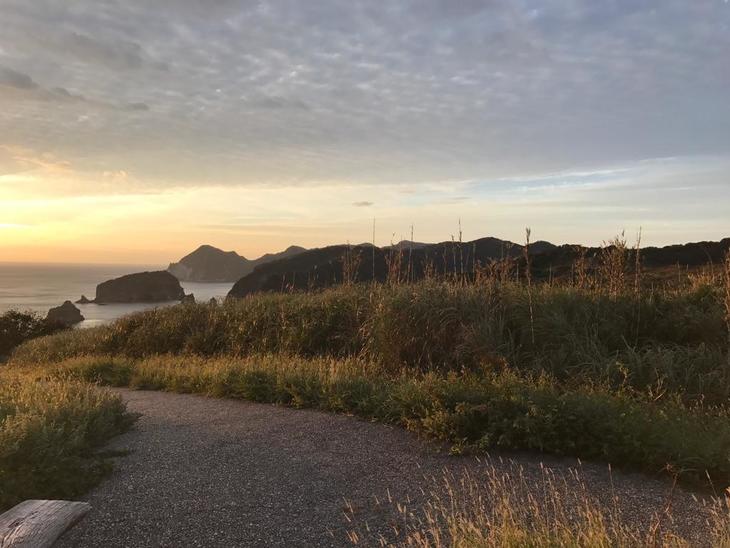 ここから約1時間後。ひとときの「ゴールデンアワー」の時間。世界が黄金色に染まります。さっきまで青々としていた草々や、美しい海、そして岩たちが光り輝いています。
