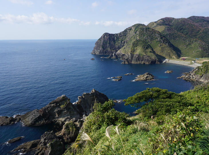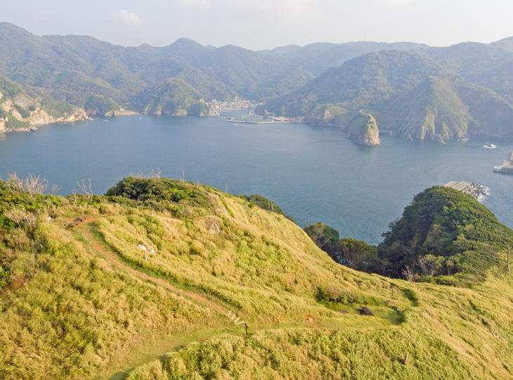 コースには二つの絶景ポイントがあり、遊歩道に入り10分も歩けば眺めのいい草原に着き、一つ目の絶景ポイントに出ます。妻良の港町も展望出来ます。