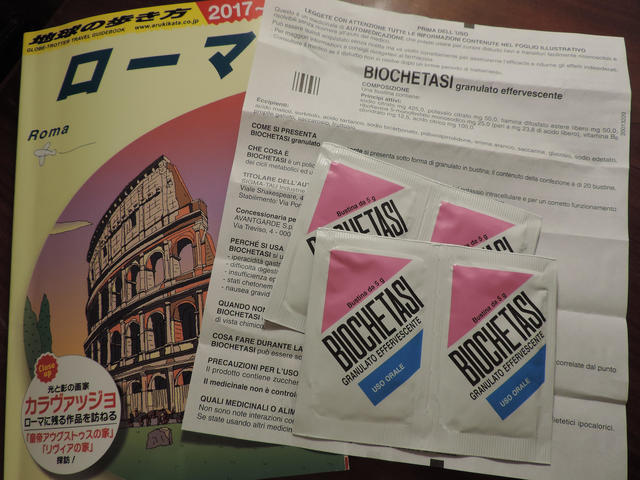 ↑ 写真は、胃酸過多、消化不良、吐き気止め用のBIOCHETASI(ビオケタスィ)と言う薬です。旅行者さんでも、処方箋がなくても薬屋さんで買うことができ、しかも良く効きます。一包5g入りで、気持ちが悪い時に1袋をコップ半分~1杯の水に溶かして飲みます。筆者も何回も試しましたが、こみ上げる程の激しい吐き気の時にも、すぐに効果が出ます。ファンタオレンジにそっくりな味でとてもおいしいです。