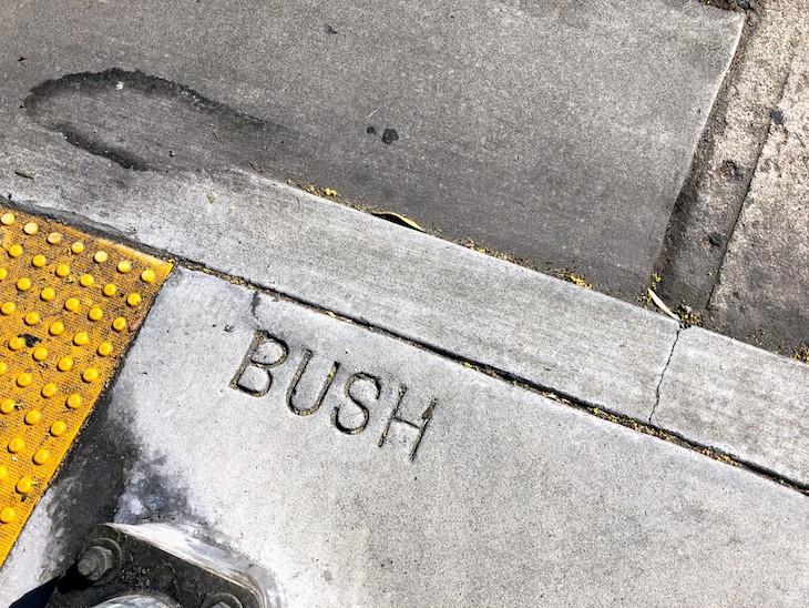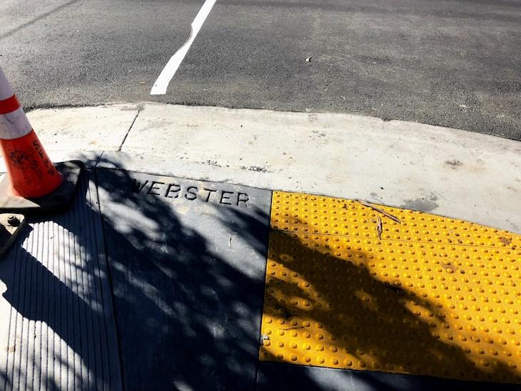 サンフランシスコでは通りのコーナー部分に必ずストリート名を示したプレートがはめ込まれています。プレートはこのような金属製だったり、アスファルトに掘られていたりさまざまですが、誰でも見えやすい場所に設置されています。