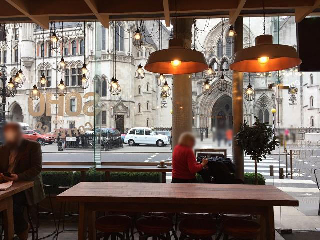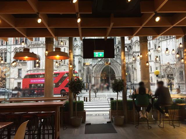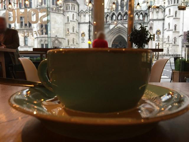 そこでトワイニングズを出て、隣で営業していた別のカフェ・チェーンに入ってみたら・・・ご覧のように全面ガラス張りで、目の前にある美しい王立裁判所が見事な借景になっているんですよ!