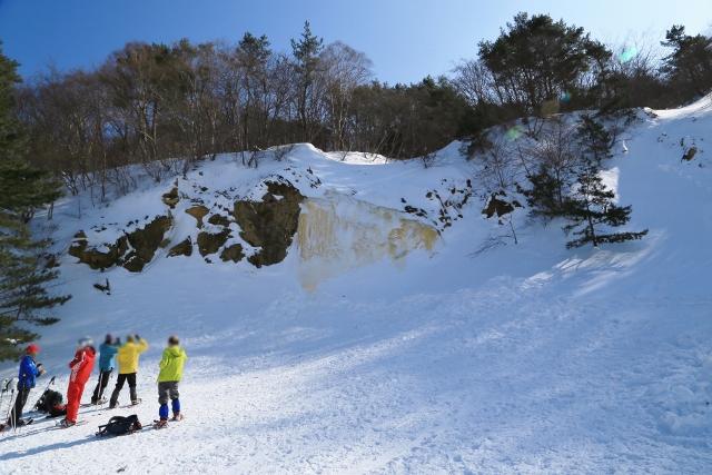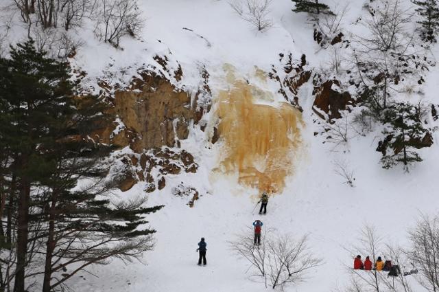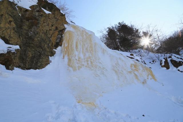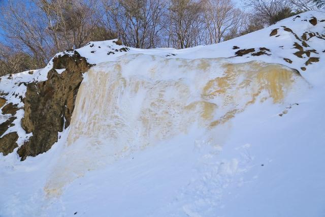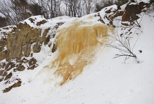 硫黄や鉄分を含んだ水が染み出す崖に出来る氷瀑です。