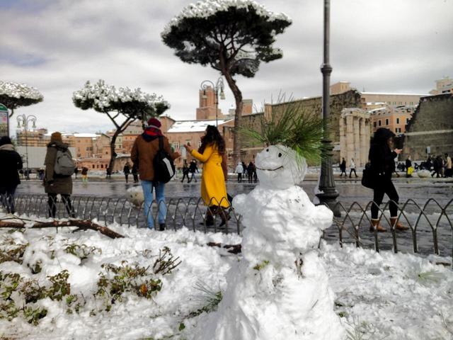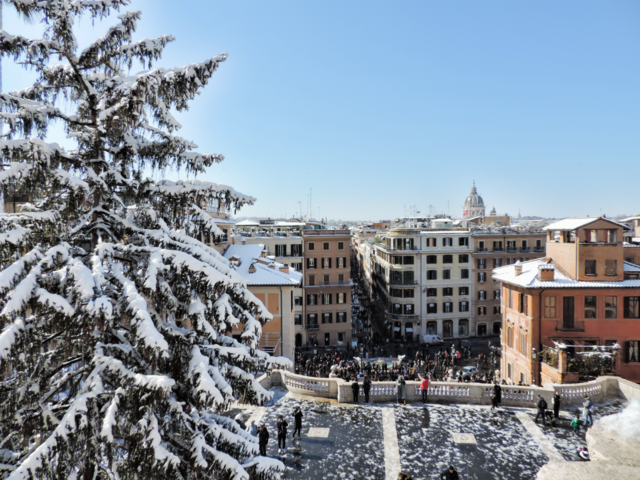典型的な地中海性気候のローマの冬は温暖で、通常は霜が降りたり雪が降ることはありません。ヤシやバナナ、極楽鳥花なども普通に地植えで年を越します。最近雪が降ったのは、2012年2月のことです。その前は1985年1月でしたので、ほぼ30年に1回のペースで白い悪魔がやって来ることになります。この1985年のものは、近年でローマで最も被害が出た降雪で、中心部で15センチ積もったそうです。