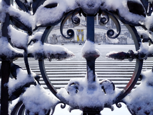 ↑ ヴィットリオ・エマヌエーレ2世記念堂の正面の階段は雪が積もって真っ白です。ローマの女神像も今日は一人で寂しそうです。