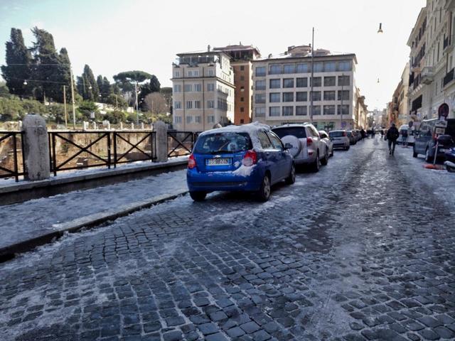 ↑ 続いて、ヴェネツィア広場に行ってみました。記念堂周辺では滑る人が続出していて、ローマ市がせっせと塩を撒いていました。ばっさばっさと節分に近いものを感じました。気象学者によると、今回の寒波は、過去60年のうち、最も厳しい寒さの一つに数えられるそうで、市では雪に立ち向かう為に334トンの塩を用意して待っていました。公共交通機関に関して言えば、地下鉄とトラムは平常通りの運行でしたが、バスは大幅に間引き運転でのサービスとなりました。(昨日と今日)