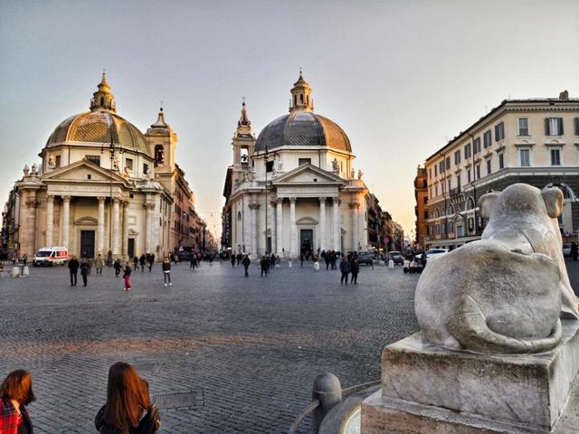 ↑ 今度はポポロ広場に寄ってみました。除雪車の出動があったのか、雪は広場の端の方に除けられています。ちょうど日没の時刻で、ヴァラディエのライオンの噴水(1828年)から見た双子教会の屋根の部分に夕日が射してきました。まだうっすらと雪が残っています。