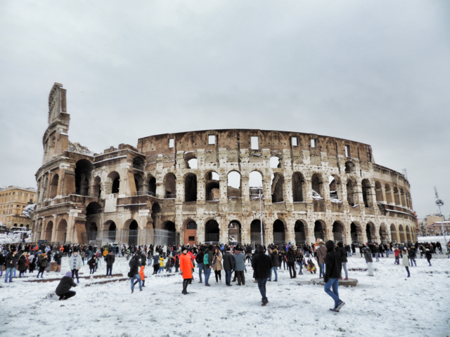 ↑ この時の気温はマイナス3度です。雪が溶けていない為、中々うまく歩けません。コロッセオまで本来ならばすぐの筈が、”私バチカン市国まで行って来ました!”と言う位、時間がかかりました。コロッセオ前では雪合戦をする人達、雪合戦に参加したくてクンクン鼻を鳴らす犬など、多くの素敵な人達に出会いました。
