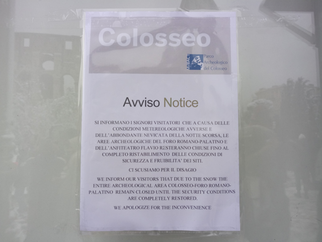 ↑ コロッセオの内部にも雪が積もっているのが外から見えました。今日は休園との看板が出ています。