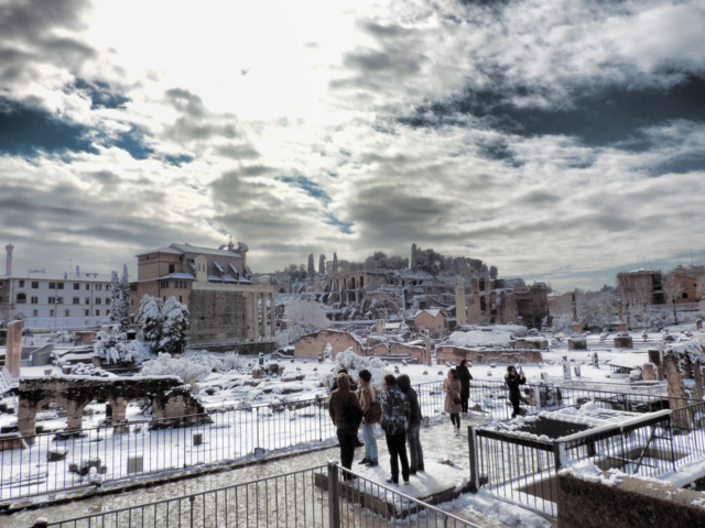 今現在もローマでは、公共の公園、ヴィッラ、遺跡、延いては墓場まで閉めています。今日はコロッセオは朝10時、フォロ・ロマーノは11時からオープンしました。パラティーノの丘とカラカラ浴場は雪山と化していて、閉園となっています。また、イタリアの鉄道(Trenitalia)を利用してローマから移動する場合ですが、ケーブルの凍結による運行休止などの情報は、公式ホームページ(Fs News)、Twitter(FS News)などで最新情報を順次更新しています。ご利用前に問題がないか、一度ご確認下さい。