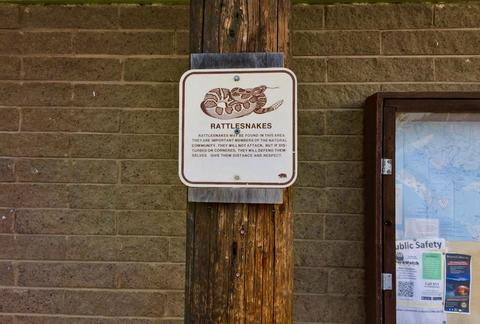 『ガラガラヘビ(Rattlesnakes)』の目撃情報が! アタックしてくることはないさそうだがマムシの仲間で毒蛇、君子じゃないが危うきに近寄らずじゃ。