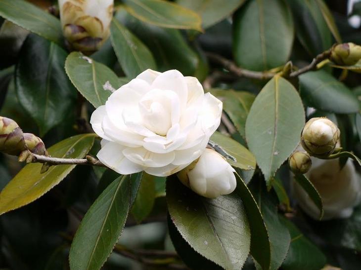 こちらは、樹齢200年を越える白椿伝説の八重白玉椿。