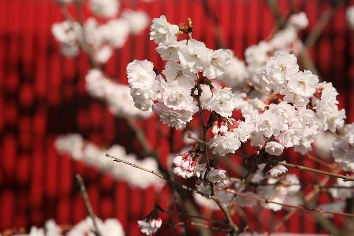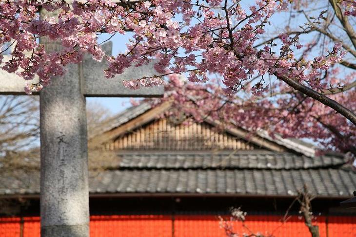 朱色の玉垣と、早咲き桜の風景。