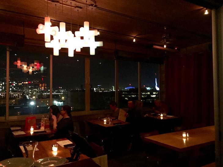 レストランの入り口は4階です。エレベーターで入り口に到着すると、長いバーカウンターが目に入ります。そしてそのバーの奥にあるアトリウムの窓からは、ダウンタウンの夜景を楽しむことができます。以前こちらのアトリウムを貸切にしたクリスマスパーティーに参加したことがありますが、夜景があるだけで、ぐっと特別感がアップしますね。その会はやたらアグリー・クリスマス・セーター(クリスマスに特有の柄を過剰なまでに編み込んだ「悪趣味」さを競うセーター)率が高かったのですが、ドレスアップしても似合うはずです。ちなみにここからの夕焼けも素敵だそうです。