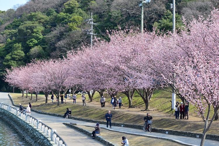 こんにちは、徳島特派員のかおりです。今年初の桜撮影に行ってきました。徳島には、蜂須賀桜(ハチスカザクラ)という桜があります。この桜は江戸時代まで徳島城御殿にあり、蜂須賀という名前は当時徳島藩を治めていた蜂須賀氏に由来しています。寒桜系の品種なので、ソメイヨシノに比べて開花時期が早いことが特徴です。ソメイヨシノでは白っぽく写りがちですが、蜂須賀桜は濃いピンク色なので非常に美しく写真を撮ることができます。蜂須賀桜が植えられているところは徳島市内に何ヶ所かありますが、今回行ったのは、徳島中央公園の助任川沿いの並木です。平日にも関わらずたくさんの方が桜を楽しんでいました。写真は3/14撮影です。