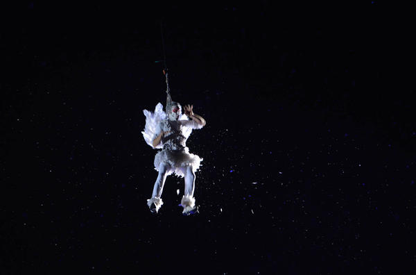 メインステージ脇に置かれたクレーン車から張られたリード線、それがサーカスメンバーの命綱。彼らは夜空に舞うだけではなく羽を地上に巻き始めたのです。空からの羽は、まるで雪が降り始めたかのようです