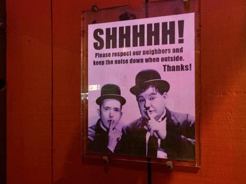 入り口にはこんな看板 "ご近所さんに配慮して外ではお静かにね!"って