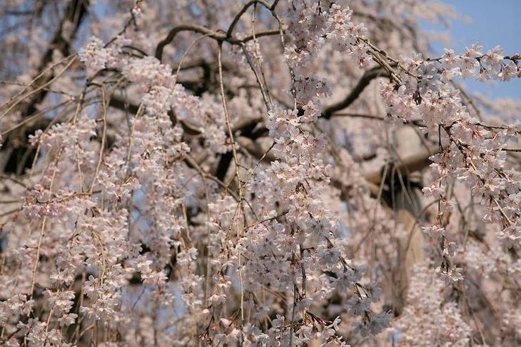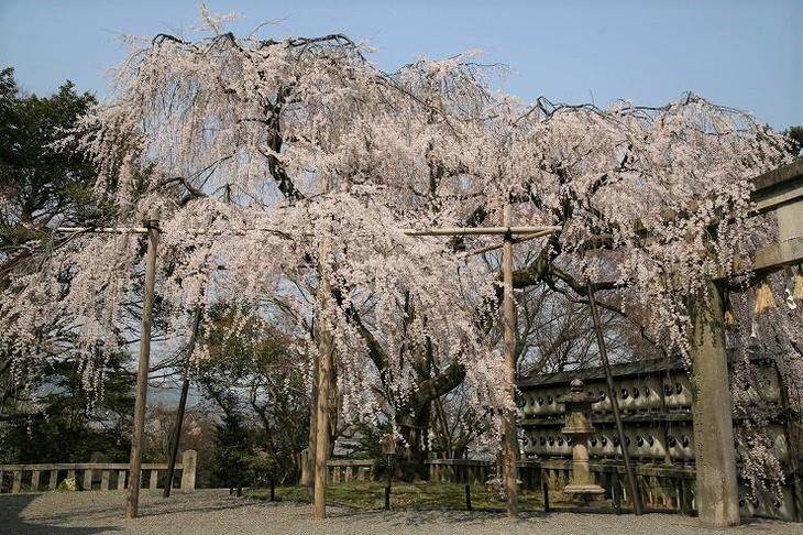 京都市山科区の大石神社では、御神木の枝垂れ桜「大石桜」が見頃を迎えています。