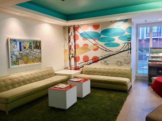 バート(BART)シビックセンター駅から歩いてもいける、マーケット通りから南側ミッション通りと7番通り(7TH ST)は連邦ビルができてから一気に再開発が進んだ。 周辺は今ブティックホテルと言われているこじんまりとしたユニークなホテルがいくつかあって一つが『アメリカニア・ホテル(The Americania Hotel)』 パームツリーが目印。