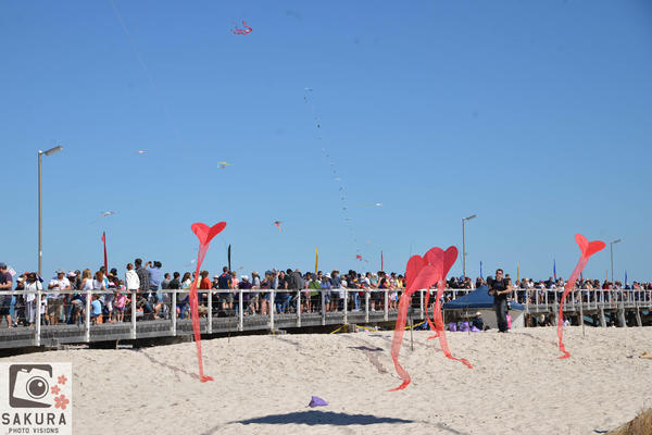 ↓スタートして上がる凧が多くなるとビーチにかかる桟橋には多くの観客の列が。ハート型の凧がほのぼのとしています↓