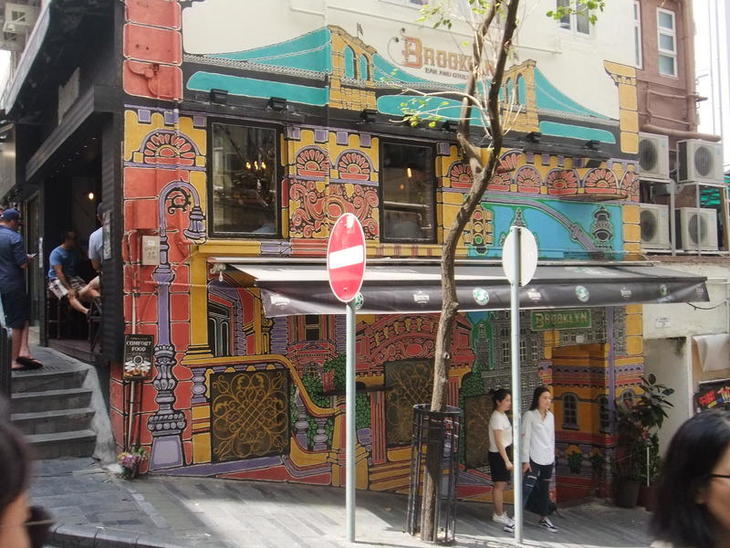 レストランの壁の絵と言えば、もう1つあります。嘉咸街と士丹頓街(Staunton Street)の交差点に「Brooklyn」というレストランについてです。こちらも側面の壁はブルックリンをイメージした絵柄です。