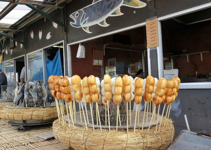 お団子(味噌or醤油)1本350円。イワナの塩焼き500円。「この味噌、美味しい!」と絶賛すると「初恋の味だからね。甘くてしょっぱくて、ときにはほろ苦いんだ」と、お店の方(笑)