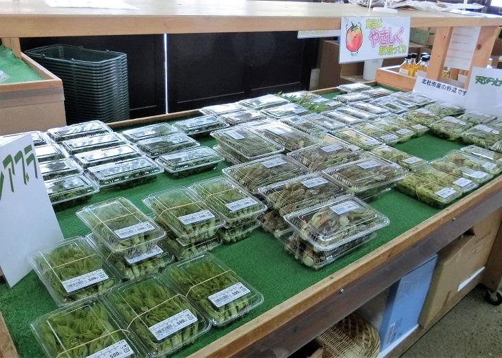 そして、タラの芽やコシアブラなどの山菜も、いっぱい。北杜市産の野菜も売っています。