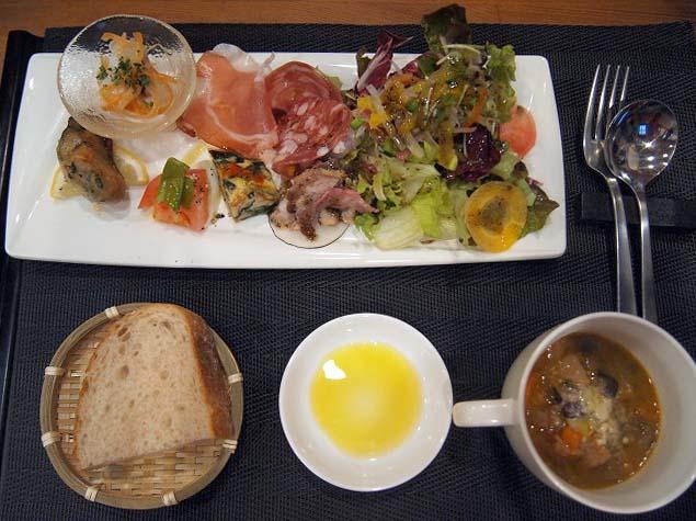 イタリアンのランチを頼むと、まず最初に前菜にパン、ミネストローネがでてきます。