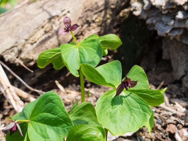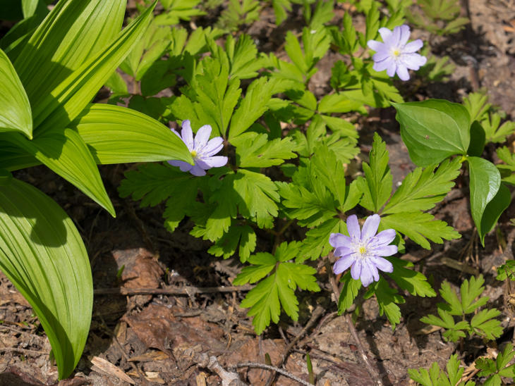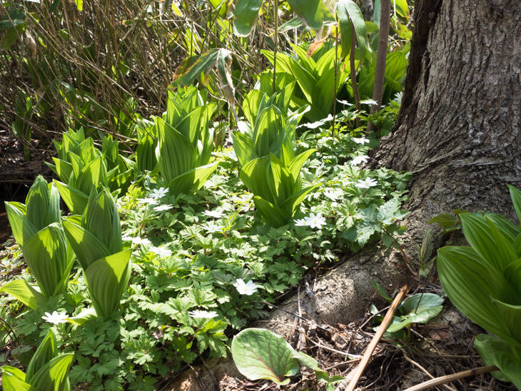 しかし、キクザキイチゲの周りに青々と伸びている葉は、花が終わったミズバショウ。
