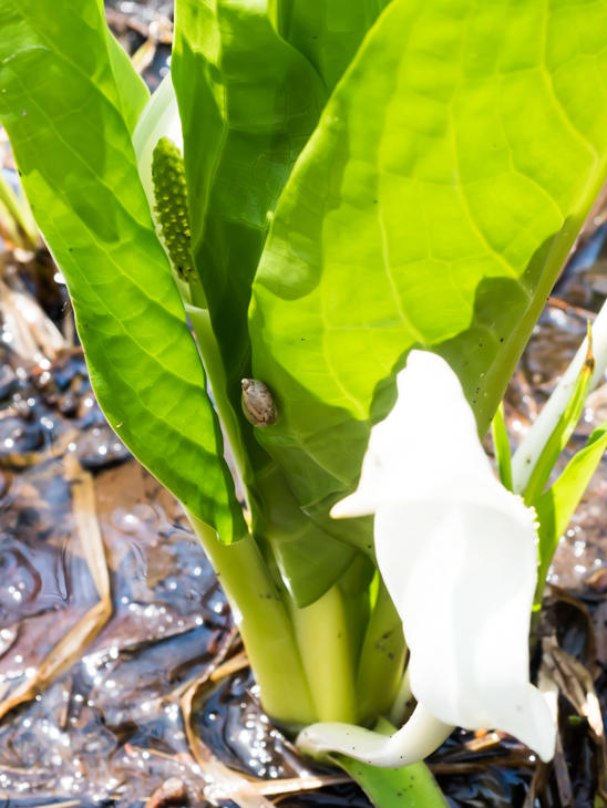 大きく成長したミズバショウの葉には、小さなカタツムリも。