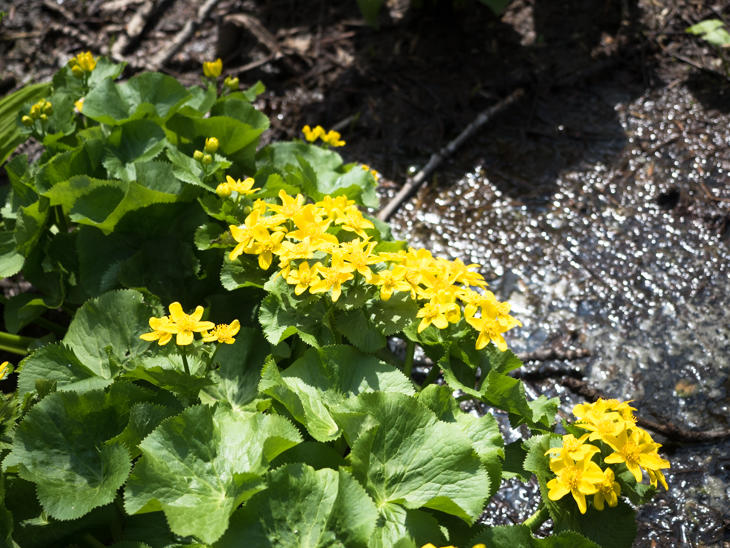 空の色とミズバショウの花に小さく感動していたところ、黄色い花を発見。