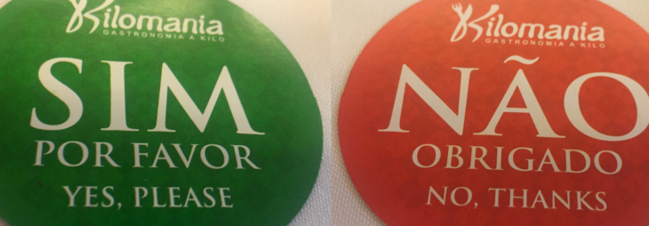 レストランによっては写真にあるようなSim(はい)、Não(いいえ)の札を用意してあって、肉の提供を求めているのならSimを表に、とりあえず今はいらない!という場合はNãoの方を上に向けてテーブルに置いておきます。