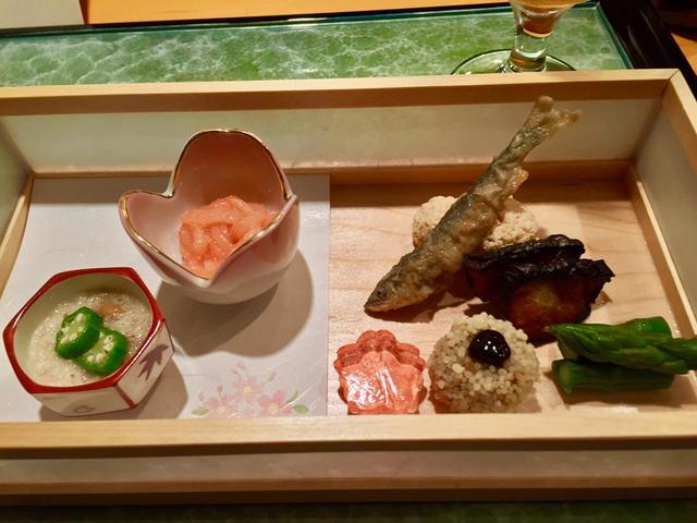 『八寸』 オクラ納豆、いか明太子、アスパラガス、和牛コロッケ、鮎(と言ってたような)