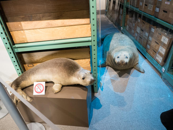 「生物標本」のエリアでは、アザラシのはく製2頭がこちらを見上げています。