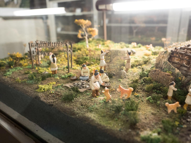 「オホーツク文化中期の集落復元模型」。