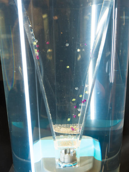 水槽の底から噴き出す水とともに噴き上げられる水晶・かんらん石・ルビーの舞い方を見ると、