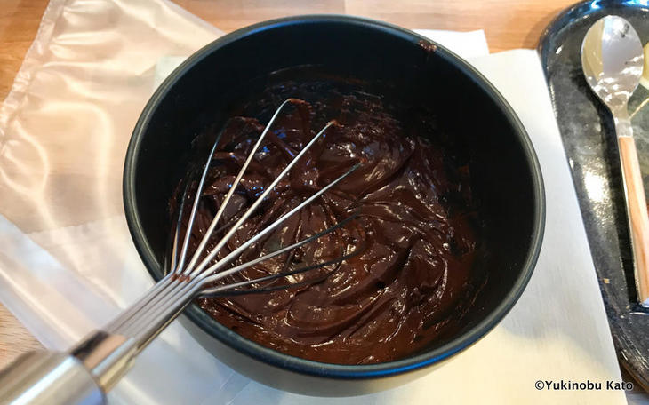 先ほど教えてもらったように、素材をかくはんし、できたクリームを絞り出します。材料はあらかじめ計量してあるものが個別に用意されているため、それを混ぜるだけ。とても簡単です。