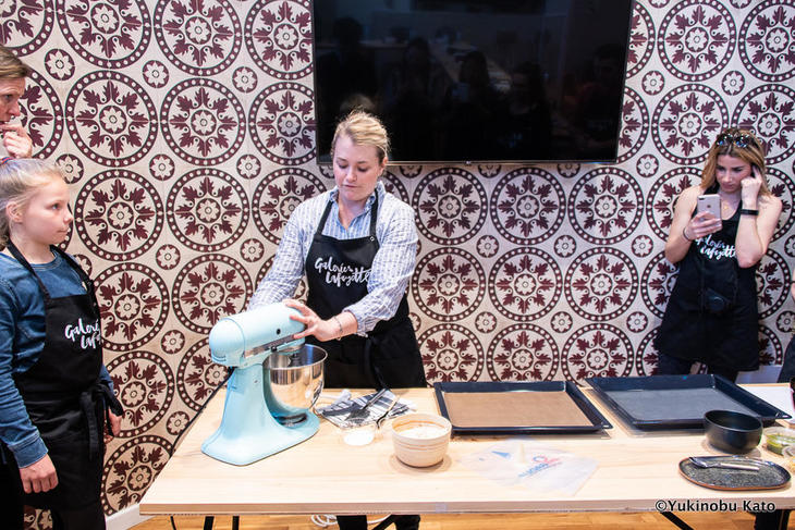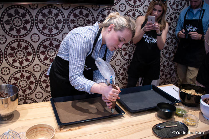 まずは先生がお手本を。そして生徒が順に、天板に生地を押し出していきます。しかし、たった今教えてもらったばかりのことでも、いざ自らやってみると思い通りにいかなかったり……。それぞれが格闘しながら、和気あいあいと授業は進みます。