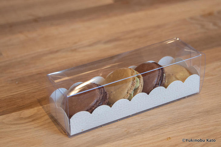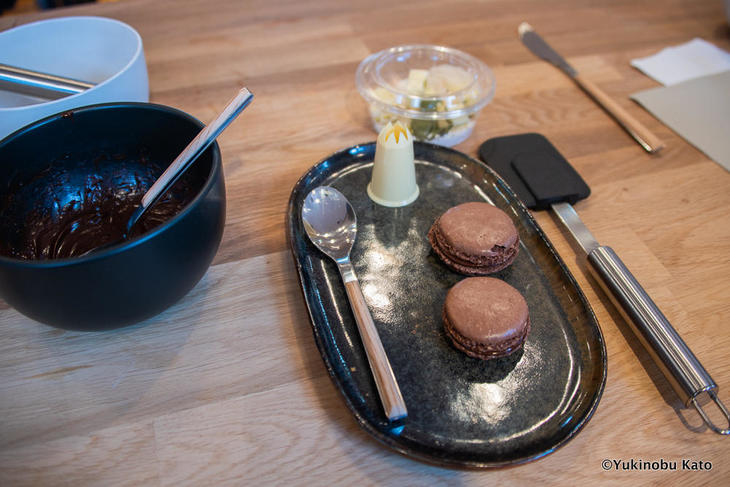 クリームが整ったら、すでにオーブンで焼き上がったマカロンの生地に挟んでできあがり。最後は持ち帰り用の箱をもらえますので、そこに自分が作ったマカロンを入れます。