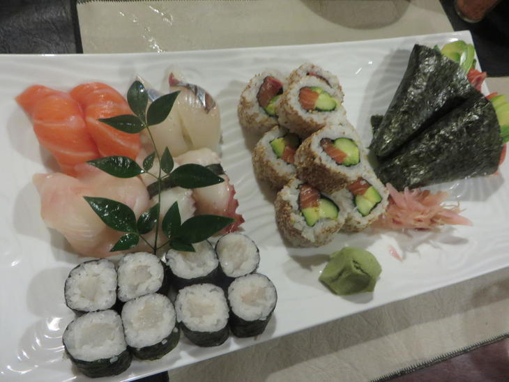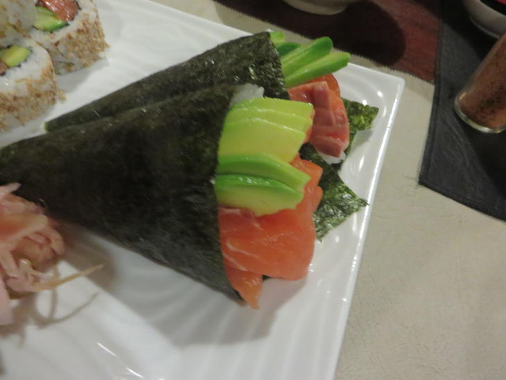 食べがいがあります。 手巻きはチリサーモンにアボガドです。大きいです。これは現地ナイズというより旬のそして地域のおいしいネタを使っているということです。 ((おさかなの種類が少ないのはアルゼンチン的には仕方ありませんが、最大限使っています))