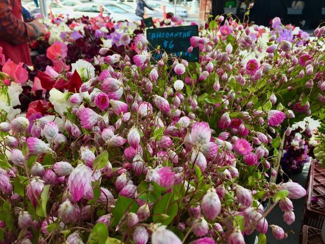 今日(朝)いろんな人が持っていた一番売れていたお花は "ローダンセ(Rhodanthe)6ドル" ドライフラワーとして人気。 お水はほんの少しだけでいいそうで、1週間〜10日くらい生花として楽しんでから下を3㎝くらい切って逆さまにして乾かす。