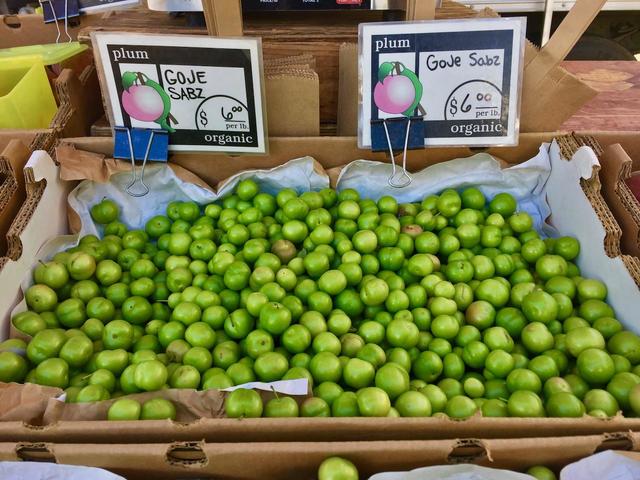 昨シーズンから気になっていた “GOJE SABZ”? なんて読むかも知らないが、プラム(Plam)とあったので青梅? 梅酒作れるのかな? これ何?って聞いてみたら「Goje Sabz」一回聞いただけじゃ分からない(苦笑) ゴジェ・サブ?? 「とにかく食べてごらんよ、中に種あるから少しだけかじってね」と少しだけかじってみたら酸っぱいのなんの。 リンゴの酸っぱさ×8=Goje Sabz酸味 と言う数式成り立ちそうなほど。 そしたら背後からWow Wooow Oh my God! 何やら歓喜の声がいっぱい聞こえた。 振り返ったらエキゾチックな面立ちのべっぴんさん達3人が何語で興奮して喋っていた。 相当珍しいらしい ⇨ 確かにスーパーでは見ないし他のファーマーズマーケットでも見た事ない。 聞けば トルコ、イラン、地中海、ペルシア辺りじゃ塩つけてかじる 食べ物らしく皆子供の頃から食べてるプラムらしい(アタシが子供の頃よく食べた果物って何だろ?)とにかくそのべっぴんさん達一人当たり2〜3lb(6ドル×3=18ドル相当)買ってた。 それはそれは嬉しそうに帰って行った。