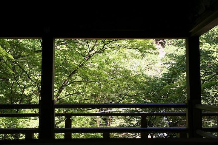 本宮前の龍船閣からは、青もみじの世界が広がっています。