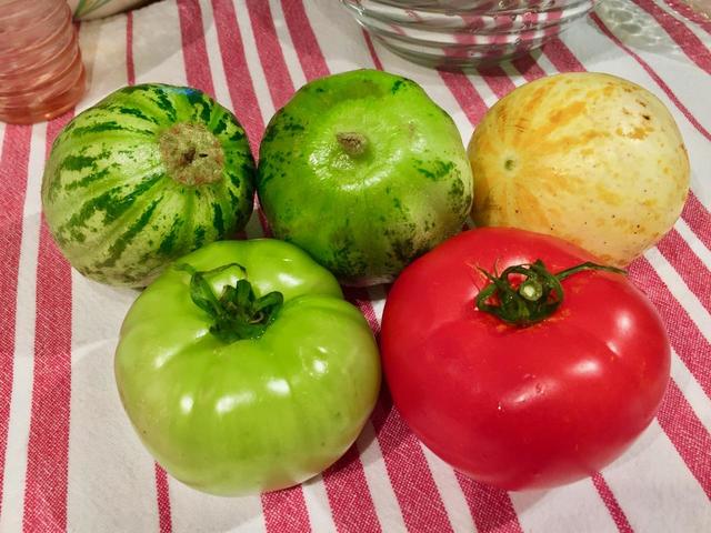 本日の野菜は、 メロンキュウリ、レモンキュウリ(黄色いの) "トラスト(Trust)" 種のトマト完熟赤トマトと熟す前の緑色トマト。