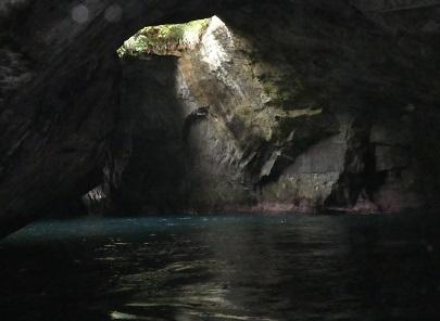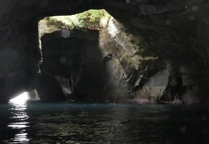 この洞窟への入口は、東口と南口・西口があり遊覧船は南口から入り、中央にある天井が丸く抜け落ちた天窓まで進んでいきます。この天窓洞の真下まで来ると、暗い洞窟の中に天井から光の帯が海面まで差し込む神秘的な光景が見られます。
