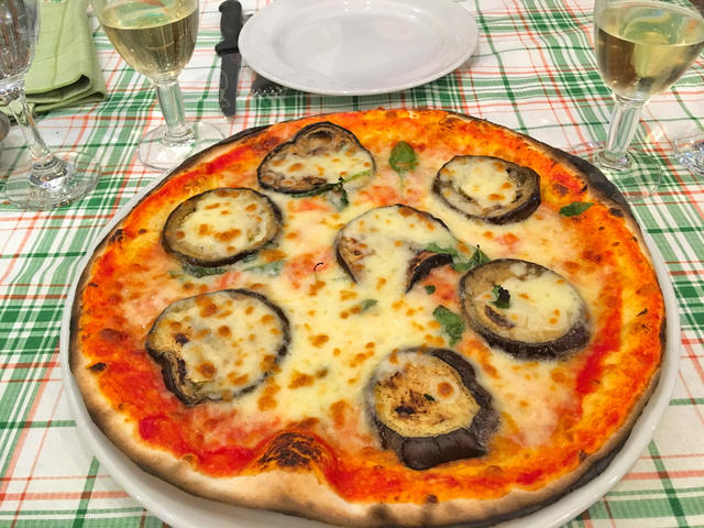 ↑ ナスと粉末のパルミジャーノチーズが具となったピッツァ・パルミジャーナ(Pizza Parmigiana)です。重そうに見えますが、生地はかりかりしています。