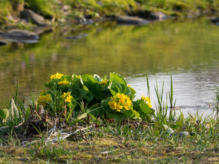 庭園には川も流れており、エゾノリュウキンカが咲いています。