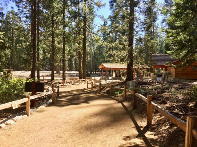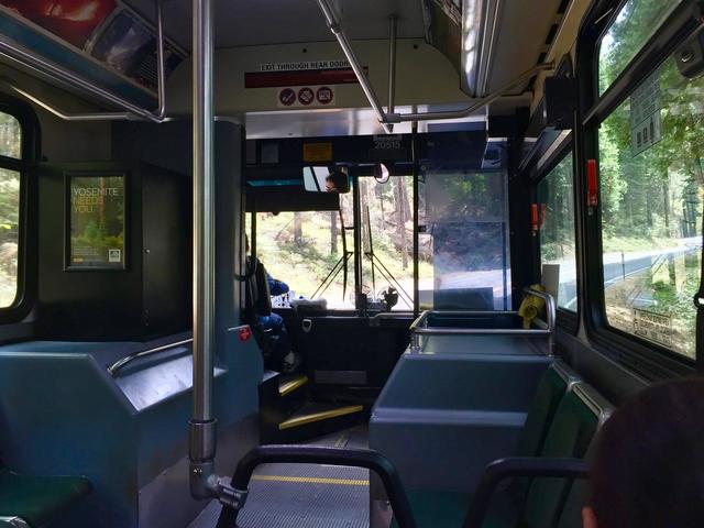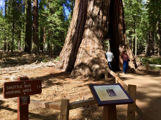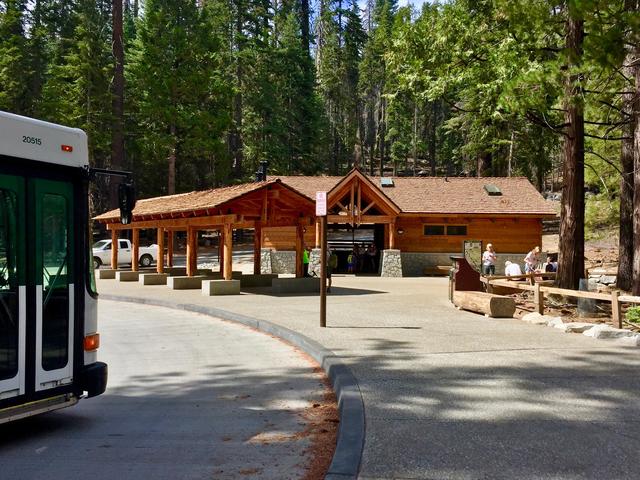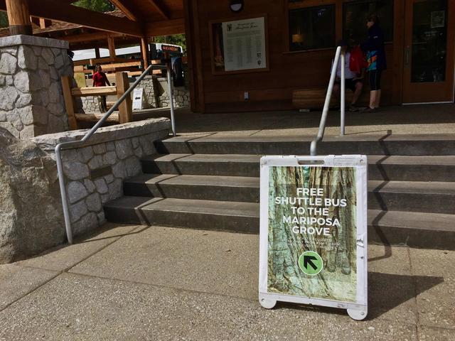 『マリポサ・グローブ・ウエルカム・プラザ(Mariposa Grove Welcome Plaza)』に車を停めそこからマリポサグローブまでは "Grove shuttle(グローブ・シャトル)" 無料のシャトルバス。 出来たばかりなんで色んなものが真新しいしギフトショップの方は初々しく働いている。