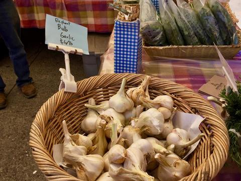 エレファントなガーリック(象さんのように大きい)が今シーズン初お目見えだったので一つ$2.50買っておいた($6/LB)ゲンコツくらい大きいけど辛味が控えめで柔らかなので加熱しない使い方が楽しめる。 下ろして "ニンニク醤油" "サラダドレッシング" に使うのがお勧め