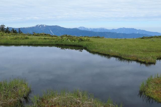 ベンチ付近から池塘の先に平ヶ岳を望みます。