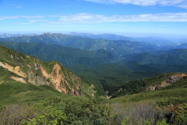 バックは、越後の中ノ岳から駒ヶ岳の稜線と荒沢岳周辺